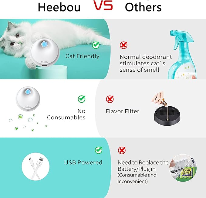 - USB Charged Battery: Heebou cat odor eliminator requires no replacement of filter. Our cat litter box deodorizer is powered by low wattage(about 1 watt). Our cat litter box deodorizer was built in 4000mAh high-performance lithium battery and recharged by USB cable(included) It can work up to 7 days on a single charge. (Ultra-quiet)The noise reduction design keeps the noise from the device under 20dB so your cat will not be disturbed.