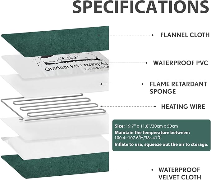 - 🐾WATERPROOF OUTDOOR PET HEATING PAD🐾 This outdoor cat heating pads is IP67 waterproof. Built with the auto thermal system to maintain the temperature between 100.4℉~107.6℉. This heating mat size is 30 x 50cm (19.7'' x 11.8''). It is suitable for most small animals, including cats, small dogs, rabbits, ferrets, chinchillas, guinea pigs, etc.