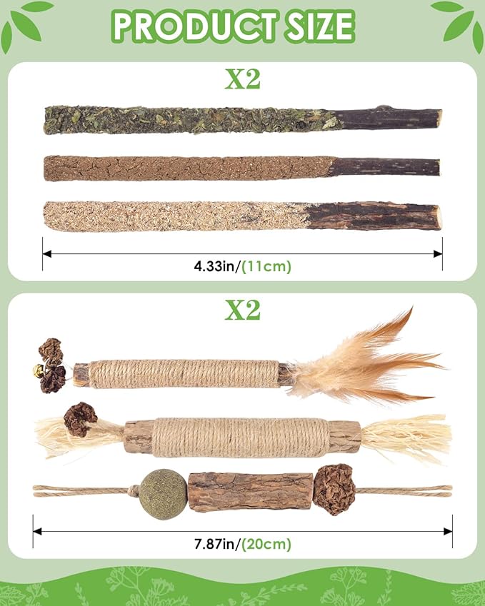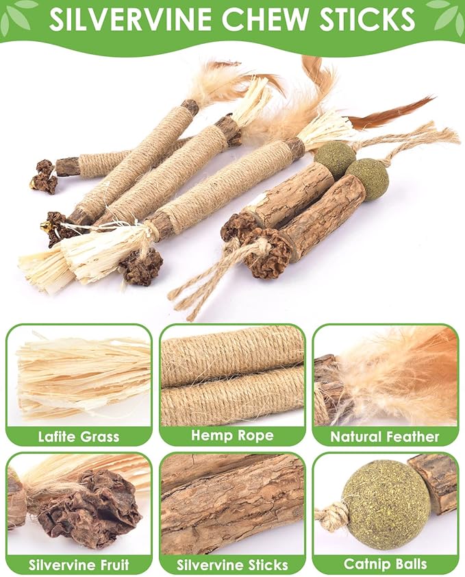 - 【Natural Silvervine Sticks】Our silvervine sticks are made from natural silvervine, raffia, sisal rope and gall fruit (fruit of silvervine), there are absolutely safe for cats to chew and bite.