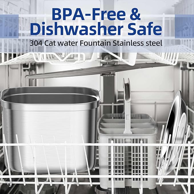 - Stainless Steel Cat Water Fountain: 73oz/2.2L, made from food grade 304 stainless steel BPA-free and dishwasher safe, easy to clean, which is also durable, hygienic, and won’t hold onto any nasty odors.