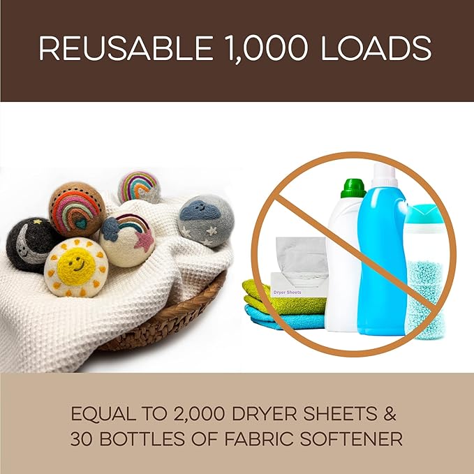 - REUSABLE FOR 1000+ LOADS – REDUCE WASTE: Why keep buying disposable dryer sheets? These cute dryer balls last 1000+ loads, replacing 2000 dryer sheets or 30 bottles of fabric softener. Fluff Ewes dryer wool balls laundry reusable deliver a cost-effective solution for 2-4 years of hassle-free laundry. Make a smarter choice for your wallet and the environment.