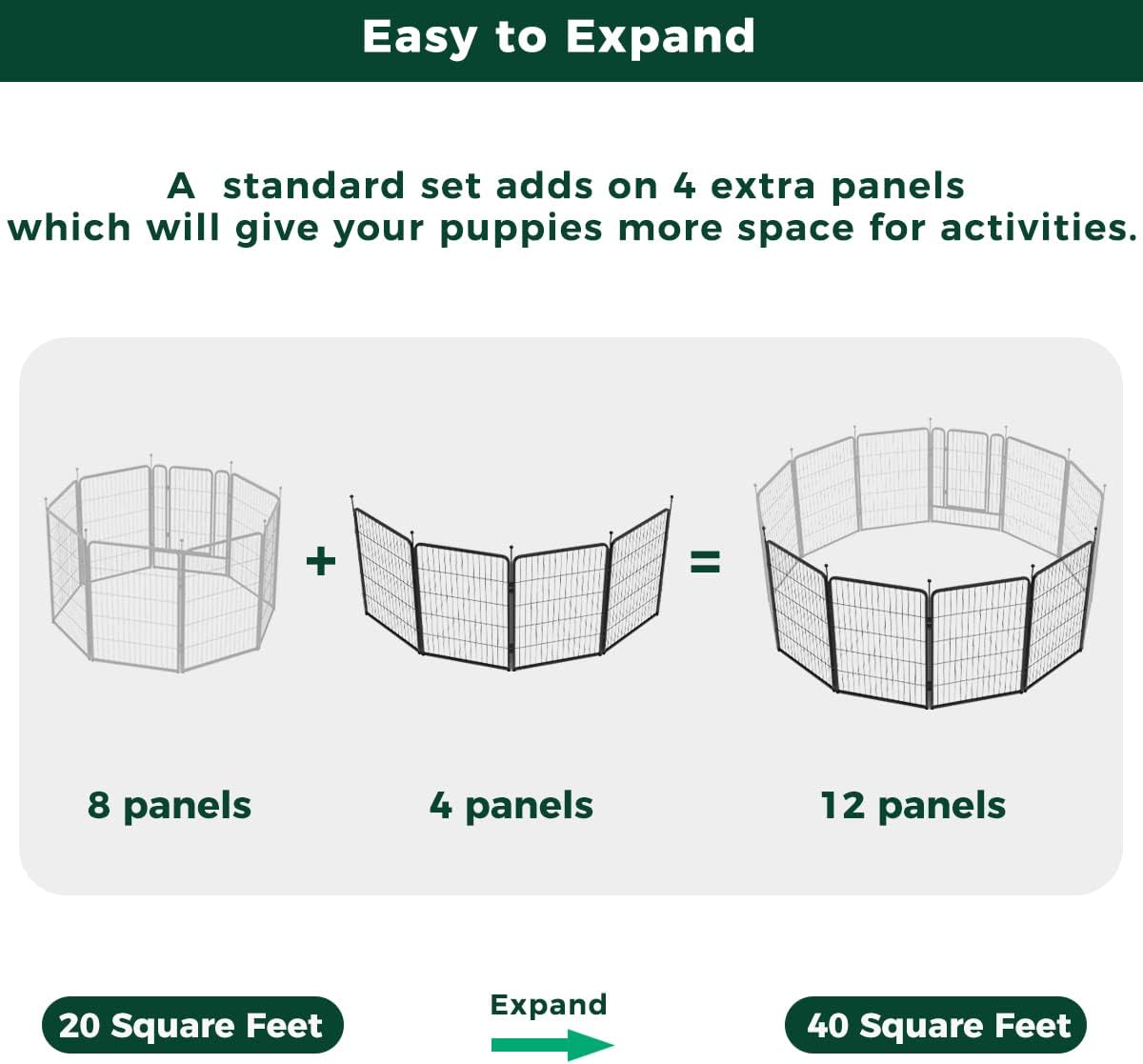 - Supper easy to assemble: It won’t take you more than 5 minutes to assemble these portable dog fences as well as pack them away due to the rod-connected design. Meanwhile, panels can be added or removed freely to give you a fully flexible area and arrange the dog pen in any shape you need.