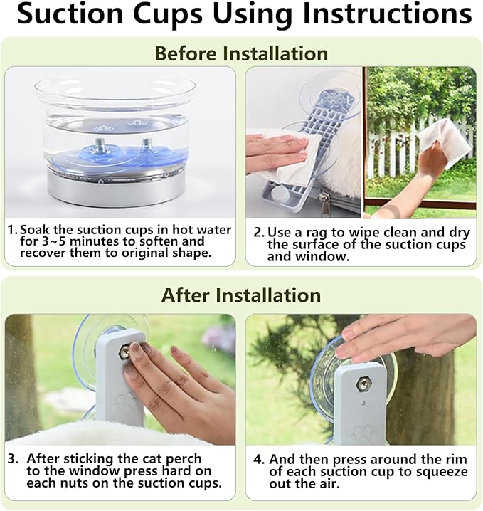 - Two Types Of Installation:AMOSIJOY cat hammock supports two types of installation. One is to install it by sticking the suction cups to the glass. It can be firmly mounted on window by 4 suction cups with strong suction power that are enlarged the diameter: 3.3 inches. Another is to fix it to the wall by drilling holes and twisting the anchors and screws, by which the bed would definitely not fall off. Besides, a DIY ladder consists of 2~3 hammocks is suitable for cats who love to climb.