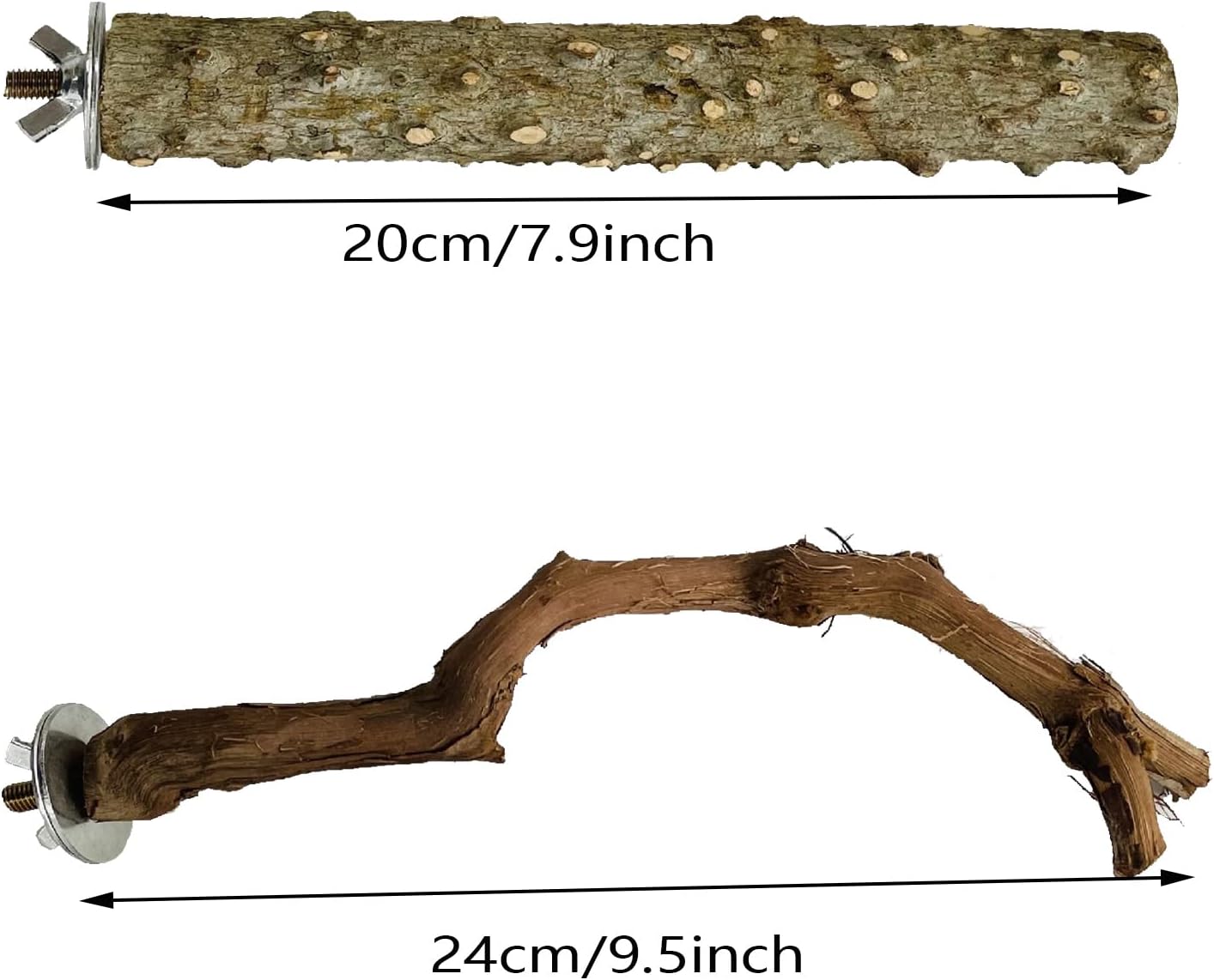 - Bird Perch Stand: a real tree branch for your parrot birds to stand, climb or play with it. Make them feel in the wild. Size: grape wood length: approx. 20 - 30cm/ 7.87 - 11.8in, diameter is approx. 1.5 - 2.5cm/ 0.6 - 0.98in, pepper wood length: approx. 20cm/ 7.87in, diameter is approx. 2 - 2.5cm/ 0.79 - 0.98in.