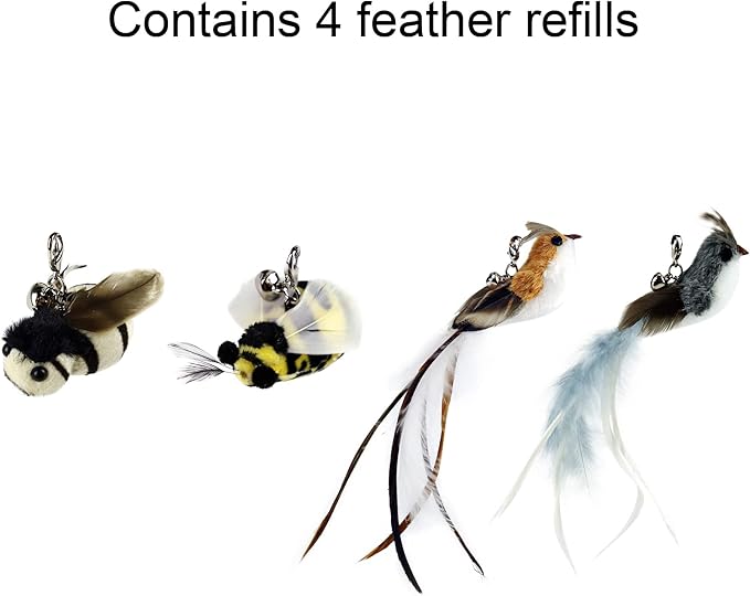 - 2. High quality and safety: feathers are made of natural materials. The handle is made of natural wood, and the rounded shape is more comfortable. Our clasps are easy to open and close to change feathers. (Package includes: 1 cat wand + 4 feather refills)