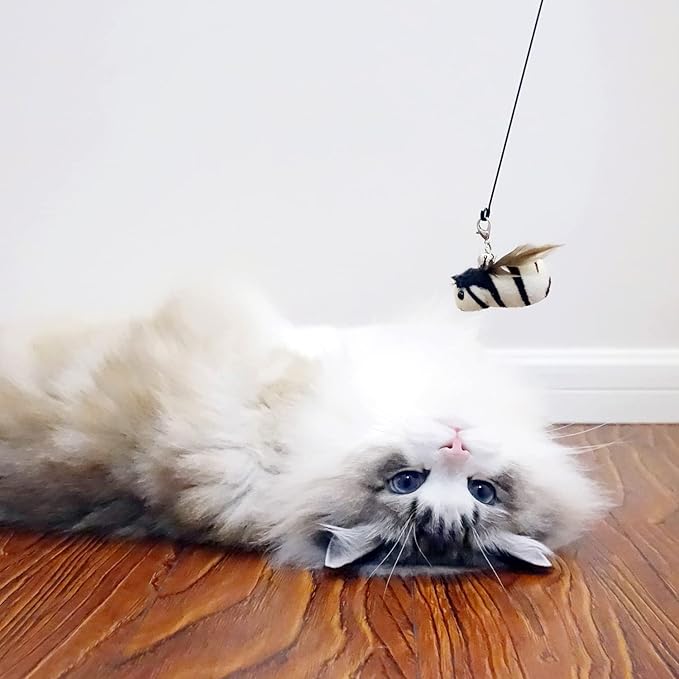 - 【Creative design】4 feather toys use 3 kinds of small animals that can fly: bird, wasp, cicada, they make cats full of curiosity. Swing the feather "bait" to get the cat excited, trigger the "hunting instinct", let them run and jump like wild animals, and make your cat go crazy with joy!