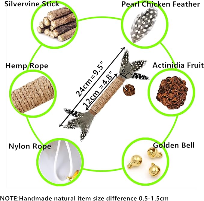 - 3.[Cat Teaser Toy with Feather]:This kitten treats for indoor kitten contains exciting durable string which makes cat chew toys for aggressive chewers more resistant to bites, dried & strong silvervine wood stick, cute kitten bell, lickable actinidia fruit. To increase the cat's interest in cat dental toy, we have added beautiful feather to teasing cat.Real fur will make cat very excited & playful, release the pressure in the process of playing & make the mood better.