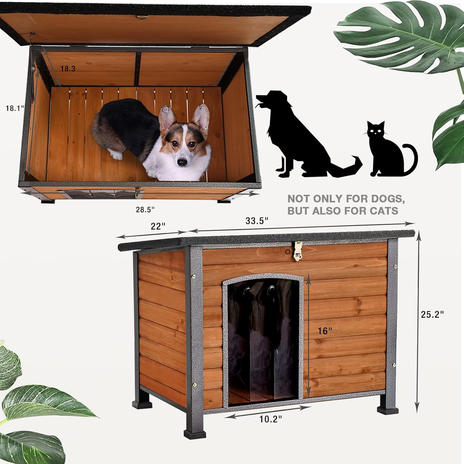 Wooden Dog House Outdoor with Iron Frame, Weatherproof Dog Kennel with Removable Floor, Anti Bite Puppy Shelter with Openable Roof (Brown, 33.5'' x 25.2'' x 22'')