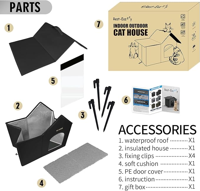 Rest-Eazzzy Cat House for Indoor and Outdoor in Summer,Feral Cat House Insulated with Mat,Clip and portable handle,Weatherproof and easy Installation,Bed for Kitten and Puppie,Never Blow Away(Black,M)