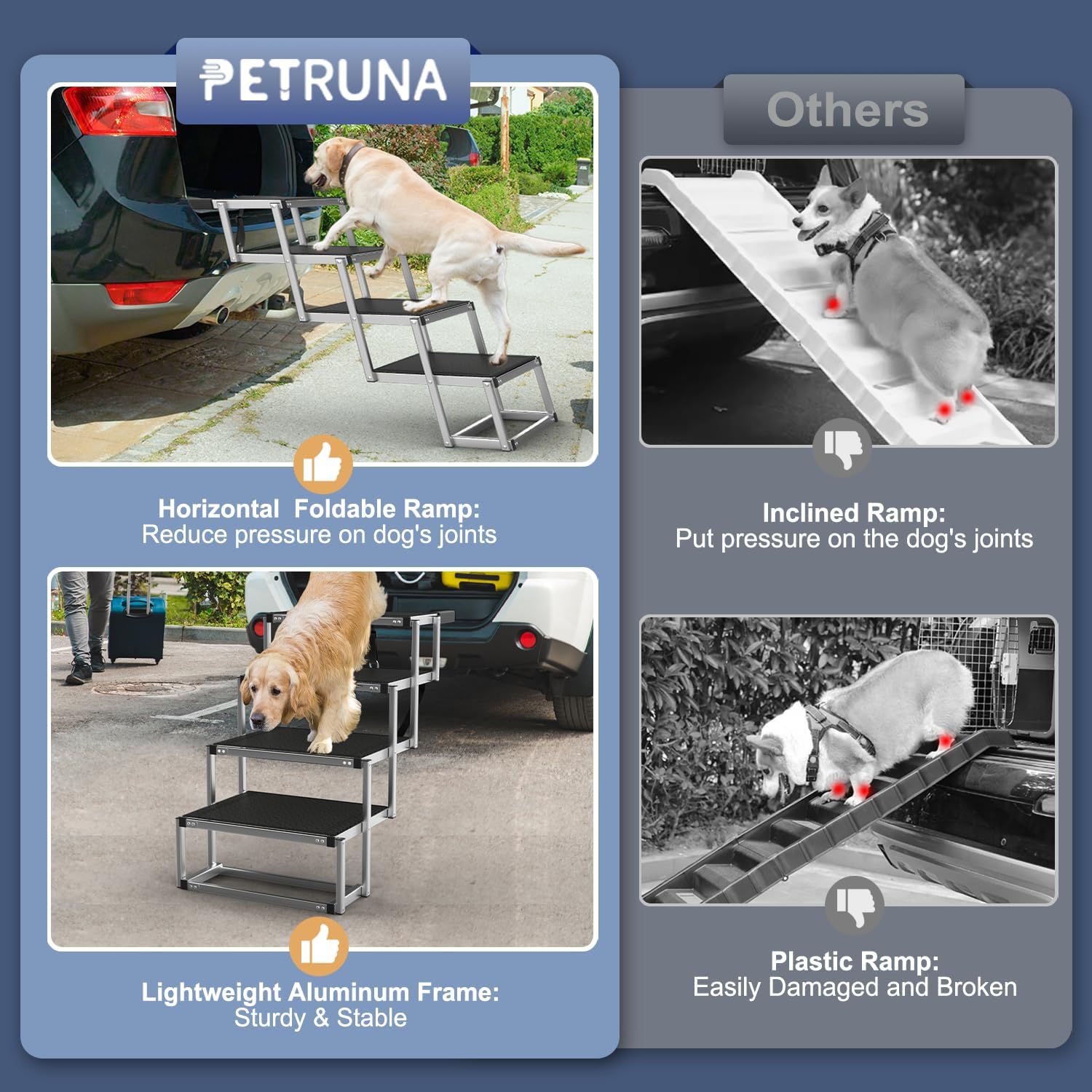 - Enhanced Durability and Upgraded Weight-Bearing Capacity: Each step of the PetRuna Dog Ramp features a rust-resistant, high-grade metal with additional load bars for a durable step that can support up to 250 pounds. It's the perfect gift to protect your pet's joints and knees from injury, keeping them safe and comfortable. The handle with foam can increase friction, provide a double layer of security for the stability of the collapsible dog steps for the car, and also help to avoid scratching the car trunk. The perfect gift for our pets, to protect their joint knee from injury