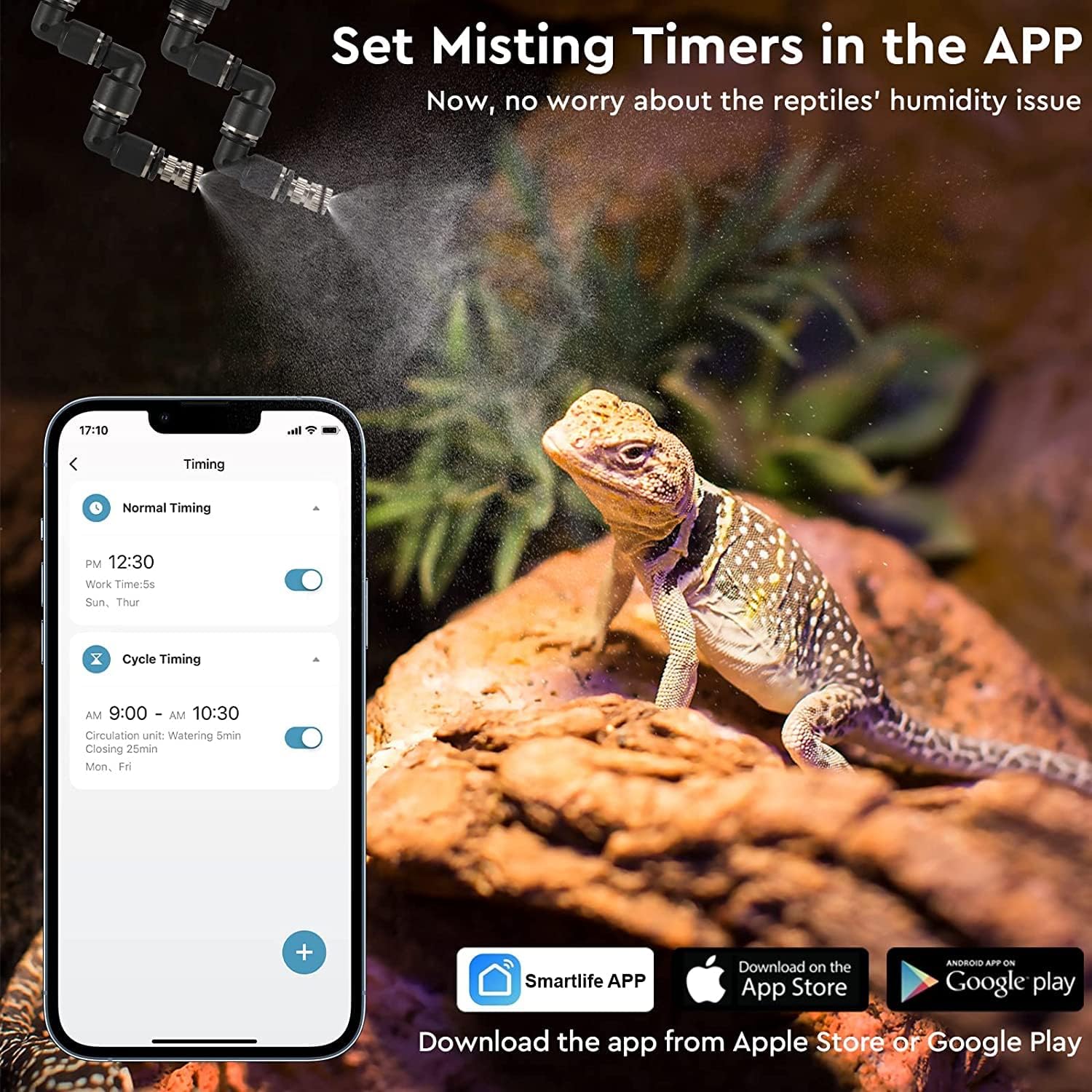 - The WiFi connectivity feature allows you to remotely control and monitor the device using your smartphone. You can use a Smartlife app to adjust the settings, turn the mister on or off, and receive notifications about the reptile misting device's status.
