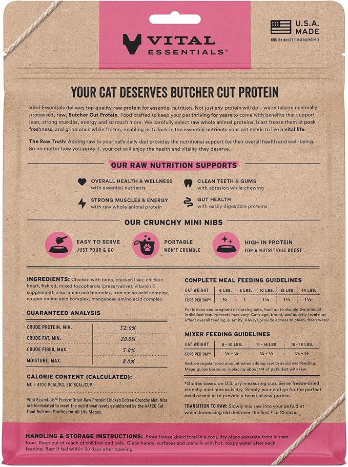 - CRUNCHY FREEZE-DRIED RAW CHICKEN CAT FOOD: Vital Essentials Crunchy Freeze Dried Cat Food packs more protein than industry standard into every bite to deliver the peak vitality your cat deserves, especially when compared to dehydrated cat food. This complete and balanced freeze-dried raw cat food is made with premium butcher cut chicken, responsibly sourced in the USA.