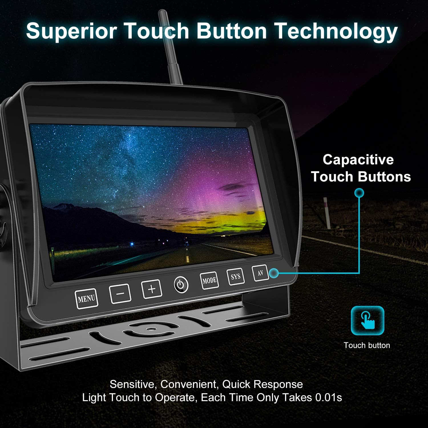 - ★ Advanced Capacitive Touch Buttons & Digital Signal: Touch buttons are more sensitive and convenient than traditional buttons. Gently touch-operated, its quick response makes it safer for you to use while driving. The wireless digital signal transmission reaches up to 108 feet in the open area, giving you a steady and real-time picture that stays steady and lag-free even when the car is traveling at speeds up to 95 MPH.