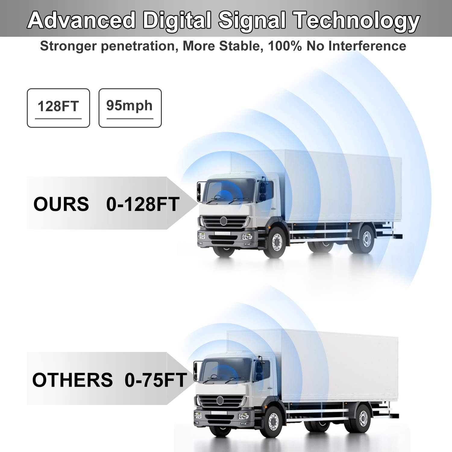 - Advanced Digital Wireless Signal Tech: The system has a stable digital signal that works flawlessly in 128 feet of open space, enough to handle any large vehicle. Even at high speeds of 102 mph, the monitor shows your surroundings in real time, making your driving easier. No interference, flicker, blur or delay.