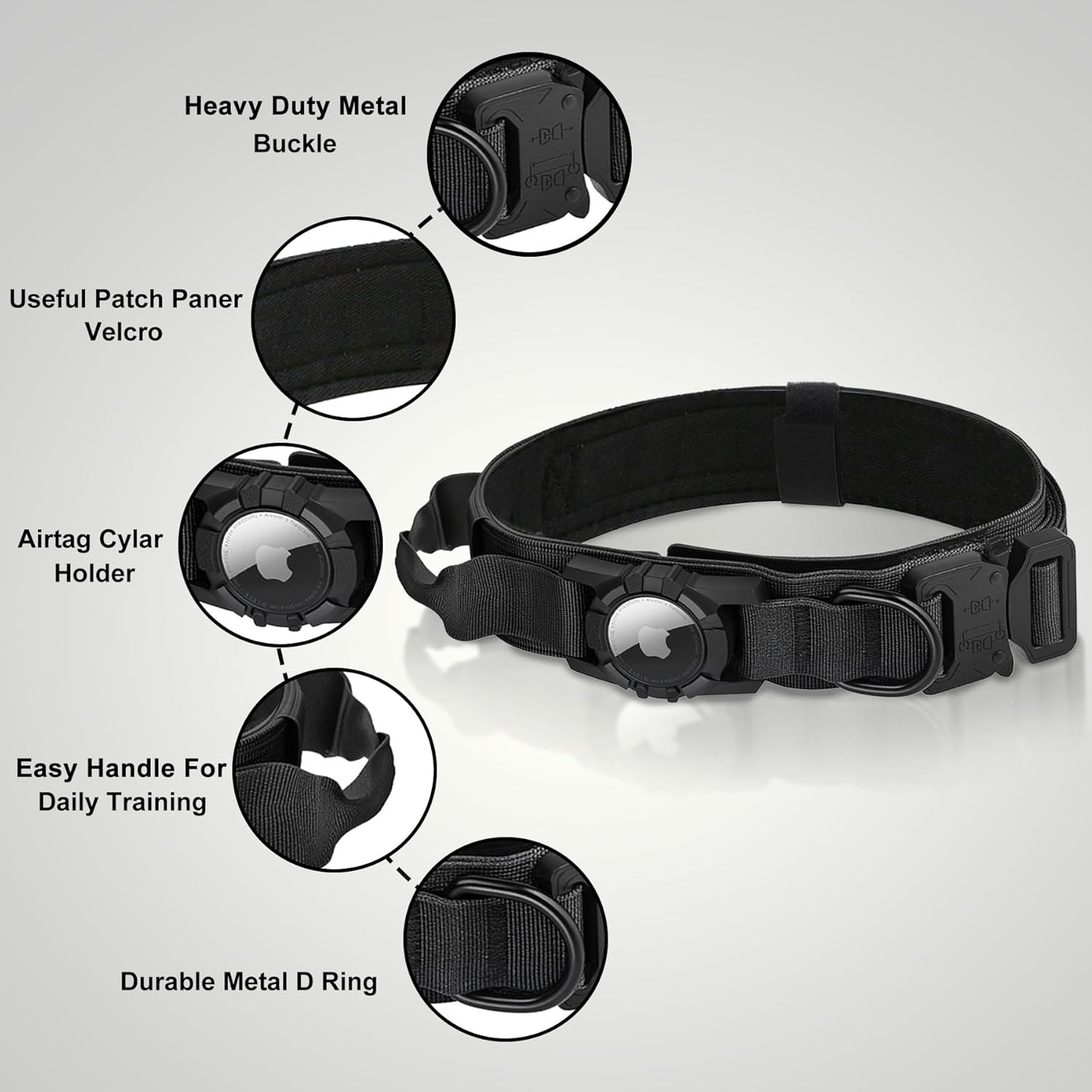 Waterproof Tactical Dog Collar with AirTag Holder - Heavy Duty Adjustable Collar for Medium to Large Dogs, Control Handle & Apple AirTag Compatible [Black,