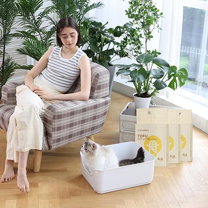 FUKUMARU Tofu Cat Litter, 100% Natural Ingredients Litter, Flushable, Dust Free, Quick Clumping, Lightweight, Low Tracking Cat Litter Pellets, Effective Odor Control, Unscented, 18 LBS (3 Packs)