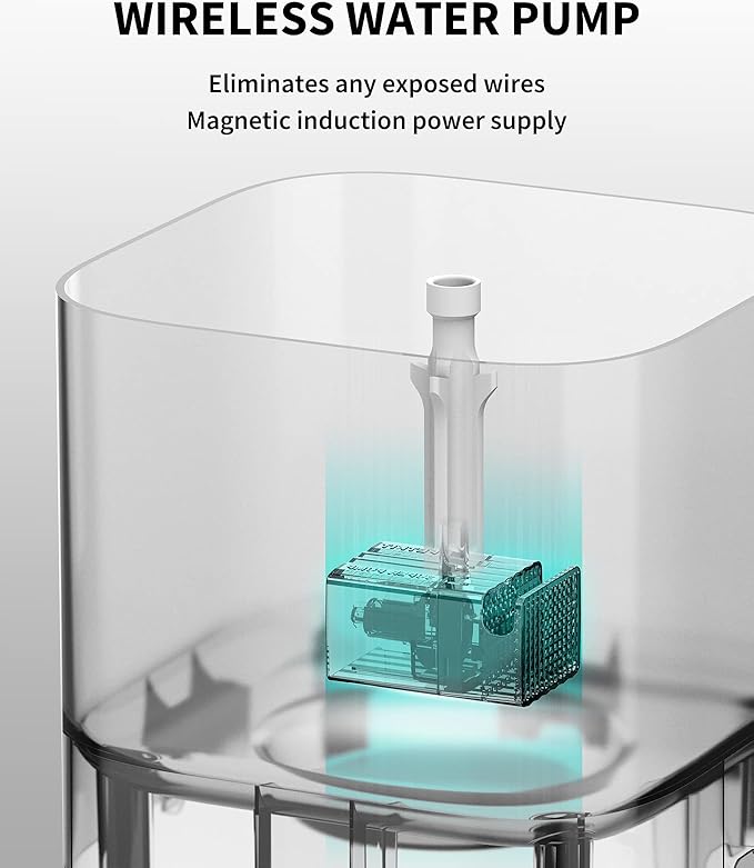 - 3.0 WIRELESS PUMP: This automatic cat water fountain uses upgraded wireless pump 3.0, which is more stable than wired water pump and does not have any wire bundle entanglement, it is more safe. At the same time, a piece of foam filter is placed in water inlet of the pump, which can intercept impurities entering the pump in advance and make the pump have a longer service life. Removable pump structure also makes cleaning easy.