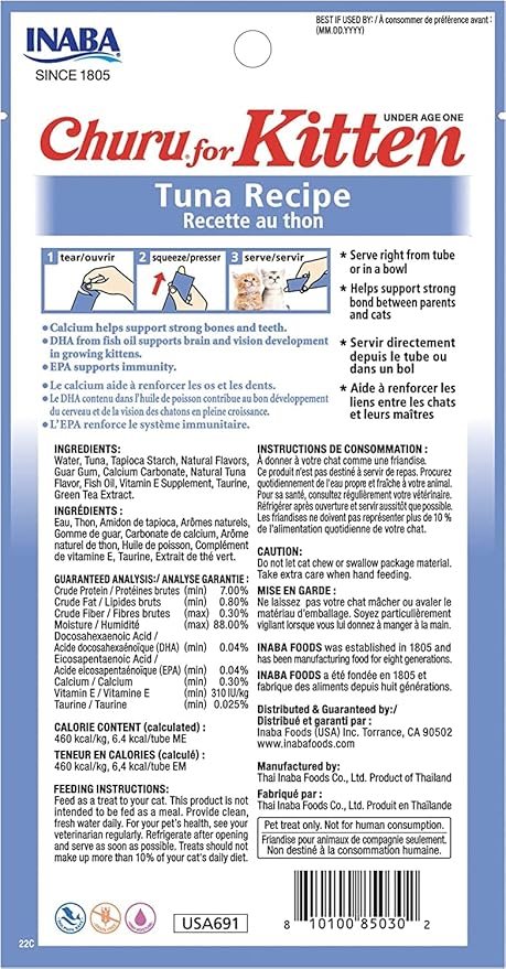 INABA Churu for Kittens, Grain-Free Creamy, Purée Lickable Cat Treats with DHA, EPA, Vitamin E & Taurine, 0.5 Ounces Each, 48 Tubes (4 per Pack), Tuna Recipe