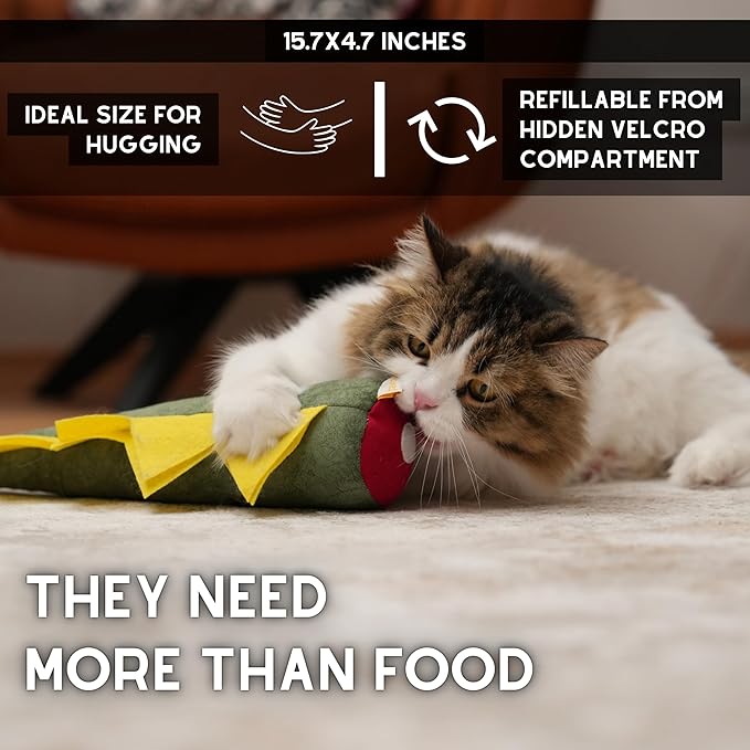 - 👨⚕️ VETERINARY DOCTOR APPROVED: On DINO, from the filling materials inside to the types of fabric used outside, each one was selected by the veterinarian, considering the most suitable products for cats. The catnip matatabi silvervine in our large cat enrichment toy helps relieve stress.