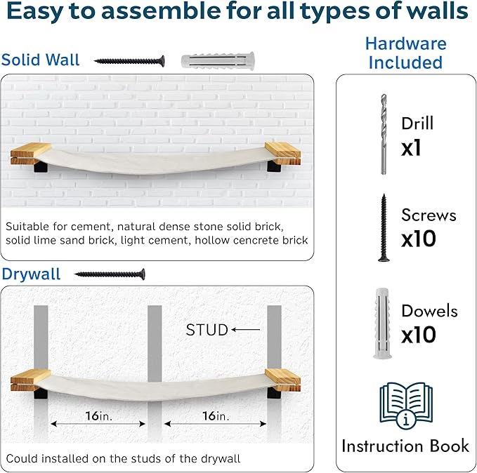 - 🐾【Easy Installation】The hammock package includes all the necessary installation accessories and comes with detailed instructions, along with a video guide to make assembly clear and simple. just follow the steps outlined in the provided instructions for easy installation. the shelf can be hung both on a concrete wall and on a dry wall. Please note that you need to drill holes in the wall.