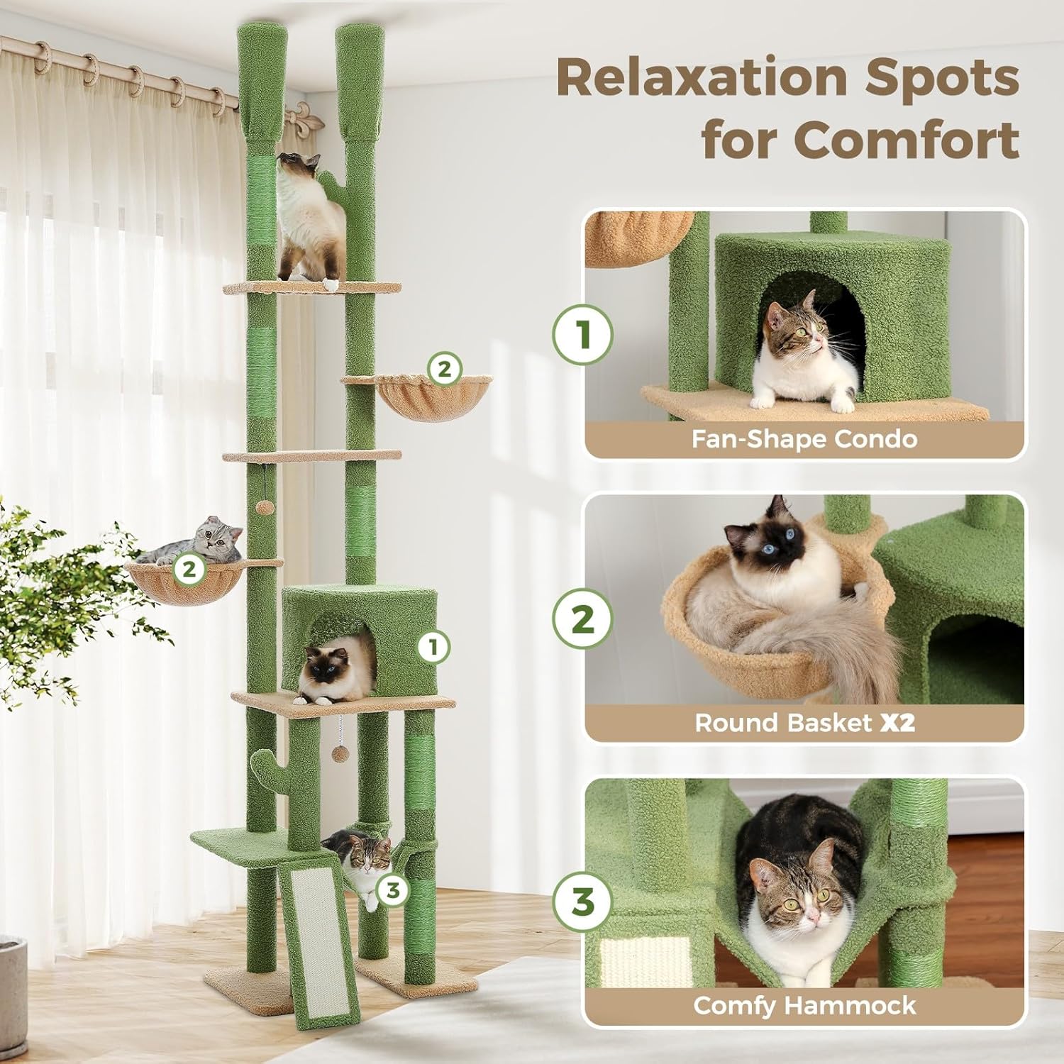 - Unique Cactus Shape: This floor to ceiling cactus-shaped cat tree in green and yellow, which suitable for multiple cats will be sure to grab full attention of your cats and also perfectly blend with your living room. Featuring with stair, 5 platforms, 3 hammocks and condo this multi-functional tall cat tree offers your furry babies enough recreation place.