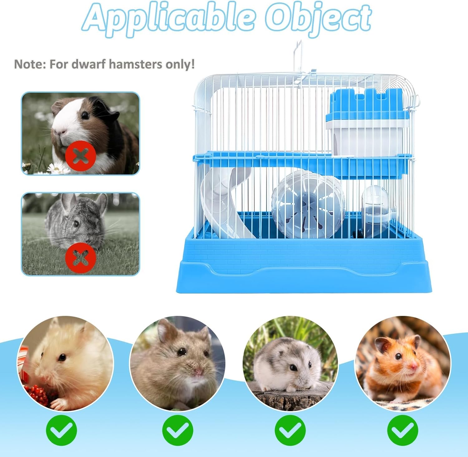 - Hamster Cage:Set includes mice cage*1, castle house*1, 2nd floor platform*1, slide*1, running wheel*1, water bottle*1, food bowl*1. The hamster cage has a sturdy structure, which allows you to ventilate the cage and see your pet's activities