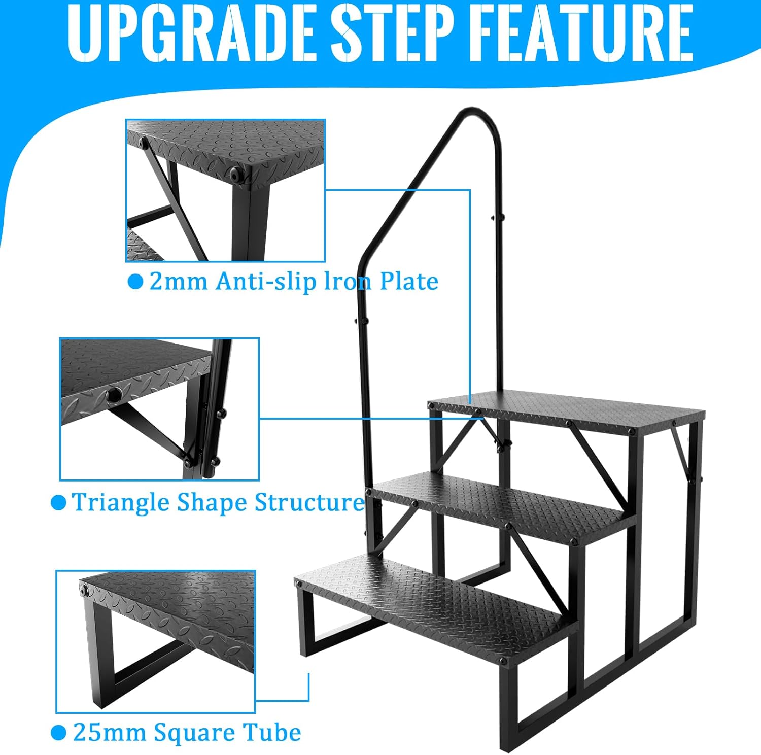 - 【Sturdy Steps】The weight capacity of our portable rv steps is 660 pounds, thus 5th-wheel RV stairs can withstand a lot of weight. Our rv steps with handrail and platform is electrostatically sprayed to enhance corrosion resistance. The triangular bars of heavy-duty metal steps provide better stability and reduce the risk of swings and falls during use