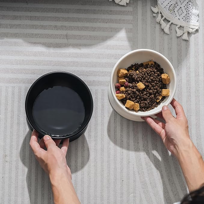 - 【PRIME FOOD-GRADE CERAMIC】Pet's feeding safety is always important. This cat food bowl is made of Lead and cadmium free ceramic, classic white/black look stylish in your home. In addition, the ceramic material makes the cat bowl stable and not easily pushed or tipped over by your naughty cats.