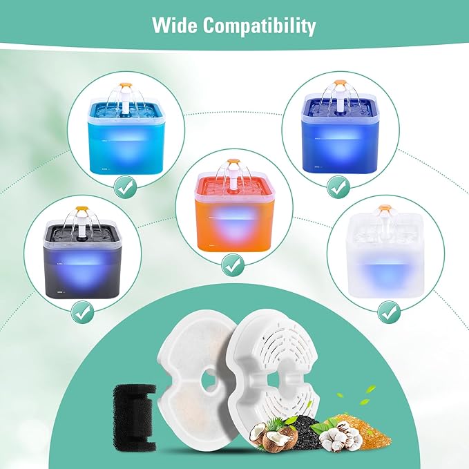 - Compatibility: Rplacement filters & pump filters set is perfect for 67oz/2L grey, orange, green, blue and clear automatic cat water fountain with led light.