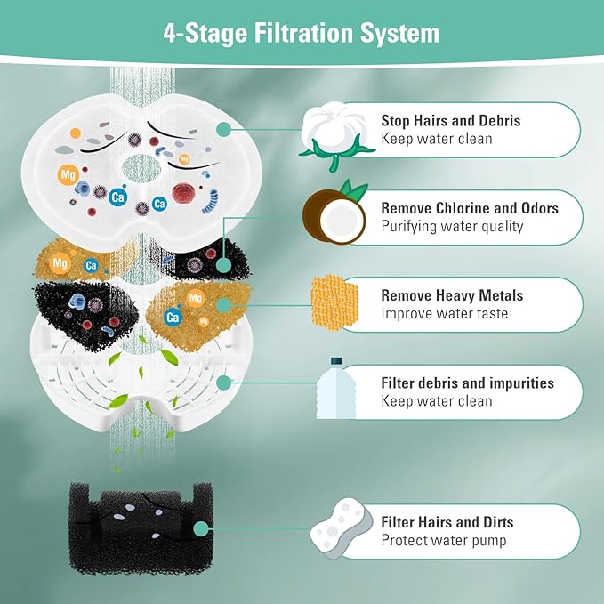 - Quadruple Filtration System: Cat water fountain filters has 4 layer filtration system. Friendly pp shell, stop hairs and large particles, high density cotton can fliter hairs and residue, keep water clean; Activated carbon can remove chlorine and odor, purify and freshen water; Ion exchange resin can filter heavy metals and improve the taste, which can encourage pets to drink more water, and reduce the risk of urinary tract infections.