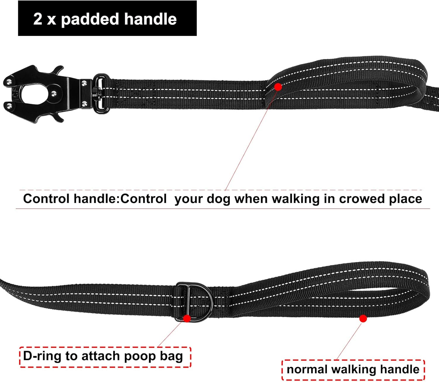 - [ Practical and Convenient ]: The rear handle of leash has a D-ring for attaching a dog waste bag. During leash-free training or playtime, the leash can be worn diagonally across your body