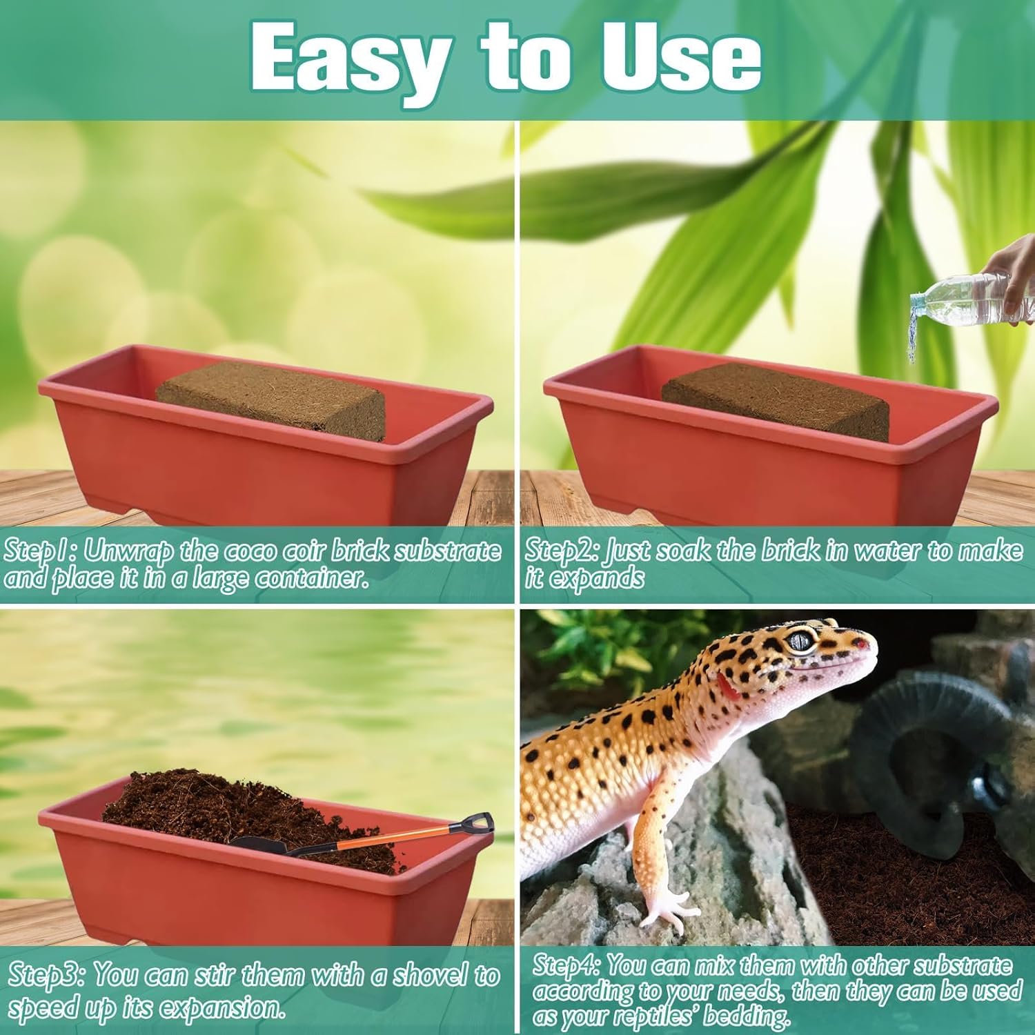- 🦎 𝑵𝒂𝒕𝒖𝒓𝒂𝒍 𝑶𝒓𝒈𝒂𝒏𝒊𝒄 𝑪𝒐𝒄𝒐𝒏𝒖𝒕 𝑭𝒊𝒃𝒆𝒓 𝒇𝒐𝒓 𝑳𝒆𝒐𝒑𝒂𝒓𝒅 𝑮𝒆𝒄𝒌𝒐𝒔: Halatool's leopard gecko substrate contains two 7.87"x3.94"x1.97" bricks (1.4lb each) of pure coconut husk fiber - enough to fill a 4.2-gallon terrarium. This organic, reusable bedding is cleaned with no dirt or foreign substances, providing the safest leopard gecko bedding for sensitive reptiles