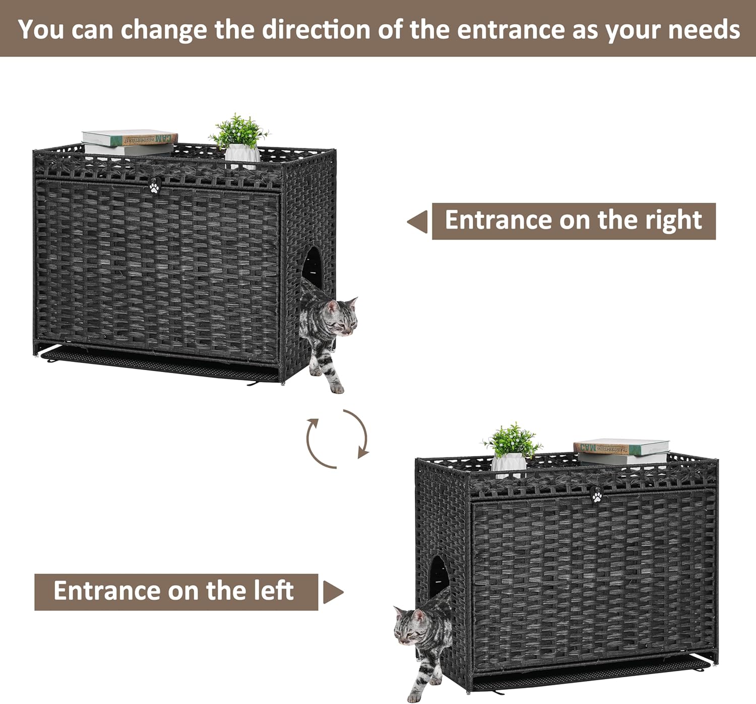 Cat Litter Box Enclosure with Soft Litter Mat; Hidden Cat Washroom Furniture with Door; Handwoven Rattan Cat House with Large Space; Pet Crate for Living Room, Bedroom, Balcony (Black)