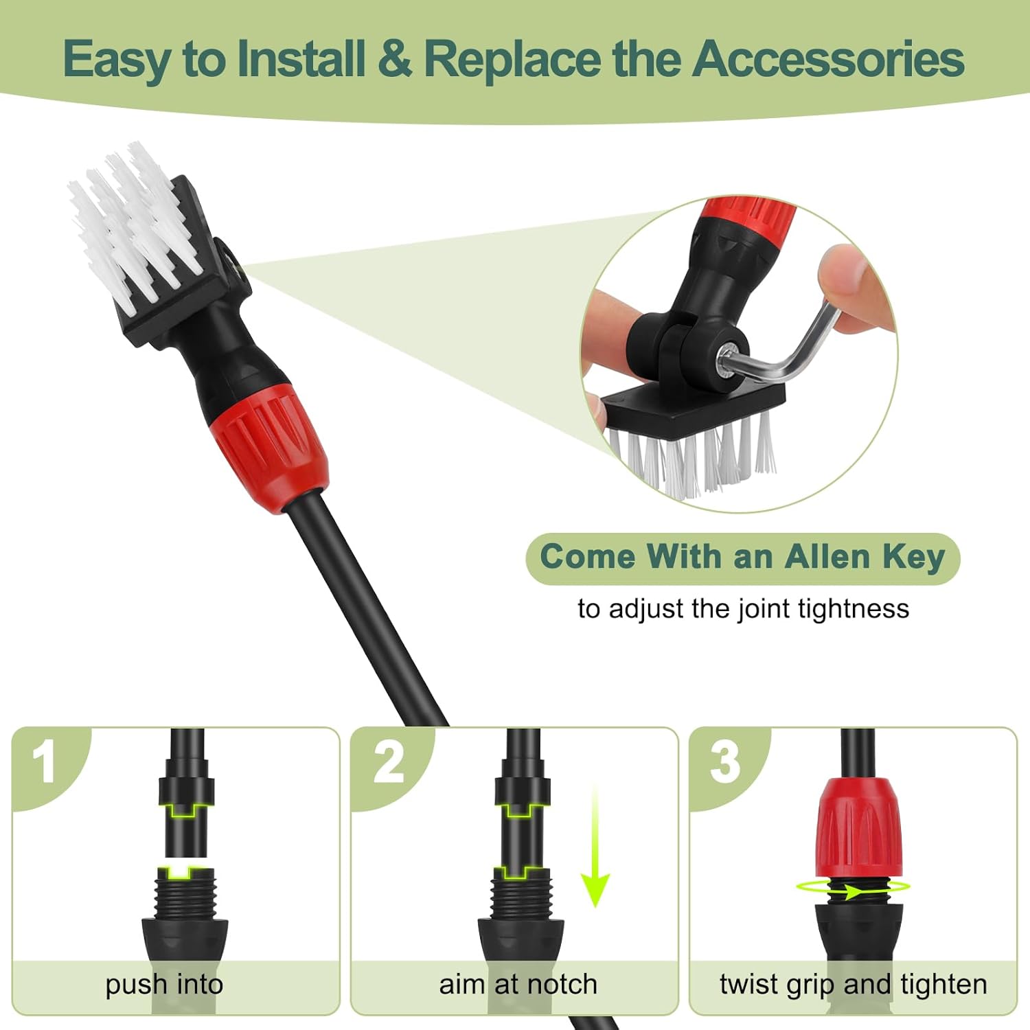 - Easy To Interchange & Use: Easy to change head without tools. Just mount the head into handle and screw it tight. The sponge and brush head can be adjusted for tightness through an internal hexagonal screwdriver to avoid shaking around while cleaning