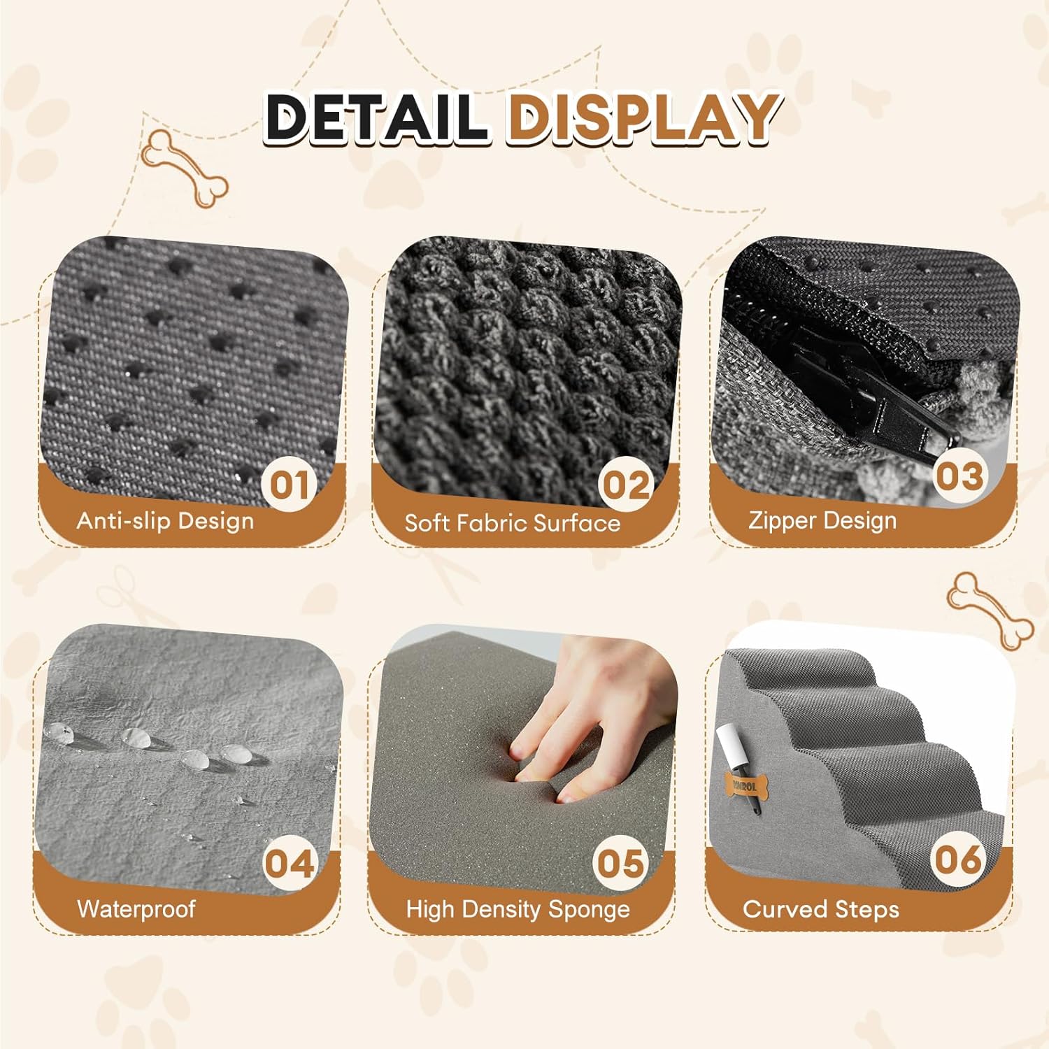 Dog Stairs, Romrol Dog Steps Ramp for High Bed and Couch, Dogs Ramp with Durable Non-Slip Waterproof Fabric Cover, Pet Stairs for Small Dogs and Cats or Pets Joints, 4-Tiers,Grey