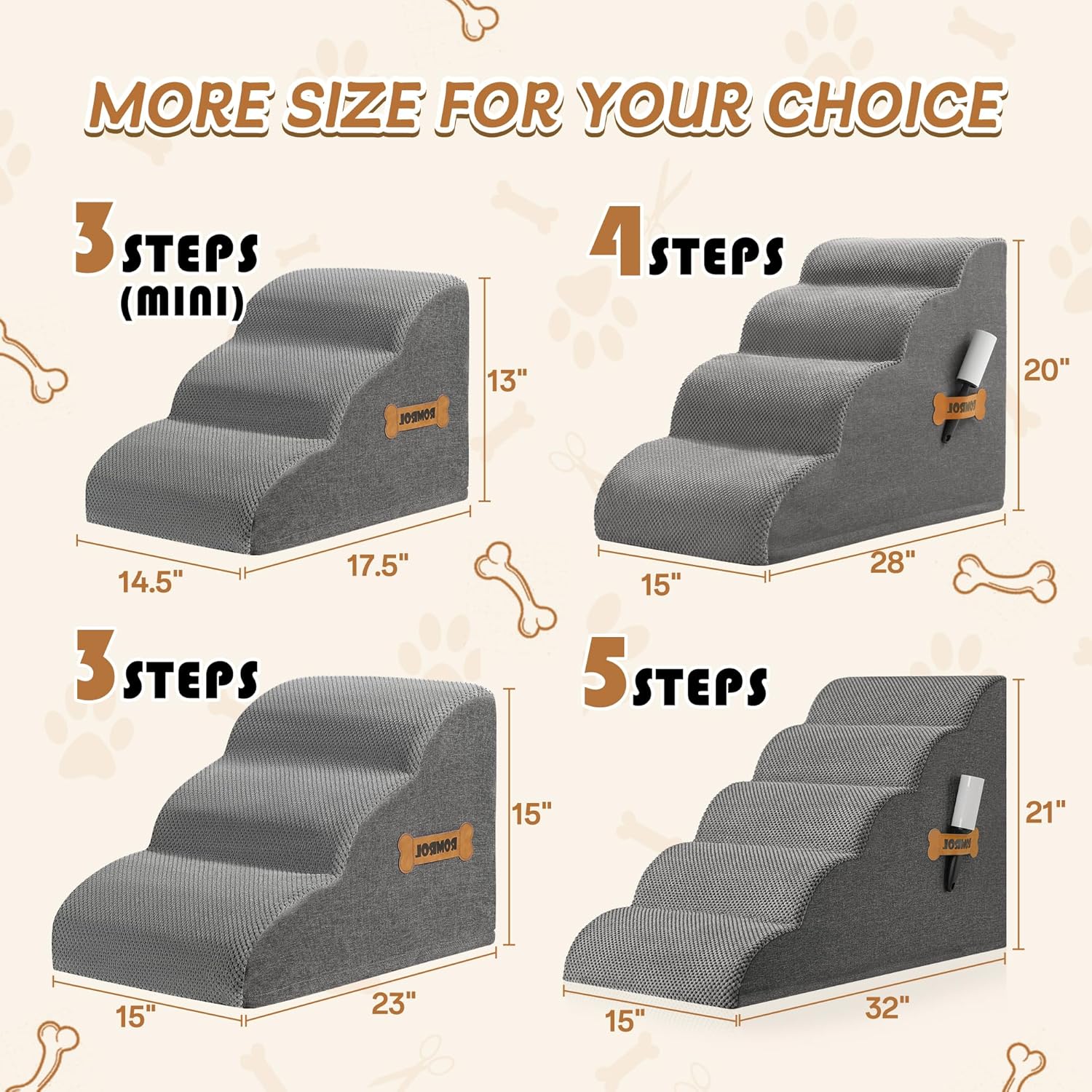 - DOG-FOCUSED DESIGN: Different from traditional right-angle dog stairs, this more scientifically designed slope dog ramp is more suitable for puppies and pets with knee joint injuries. The size of the 4-step pet stairs is 15.7*28.7*20.8 inches, whether it is the bedside, sofa or bay window