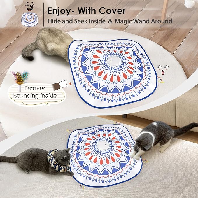 - 🐱【4-in-1 Cat Toys】ORSDA 4 in 1 interative cat toys for indoor cats includes Hide and Seek, Chase the Feather, Holes Mice Whack-A-Mole, Catch Magic Wand. which comes with a removable play blanket which allows the toy to move unpredictably, stimulate your cat's hunting instinct.When your cat gets tired of playing with the cover, remove it and the long spinning wand entices your cat to pounce, while the feathers that pop out of the holes stimulate a game of whack-a-mole.