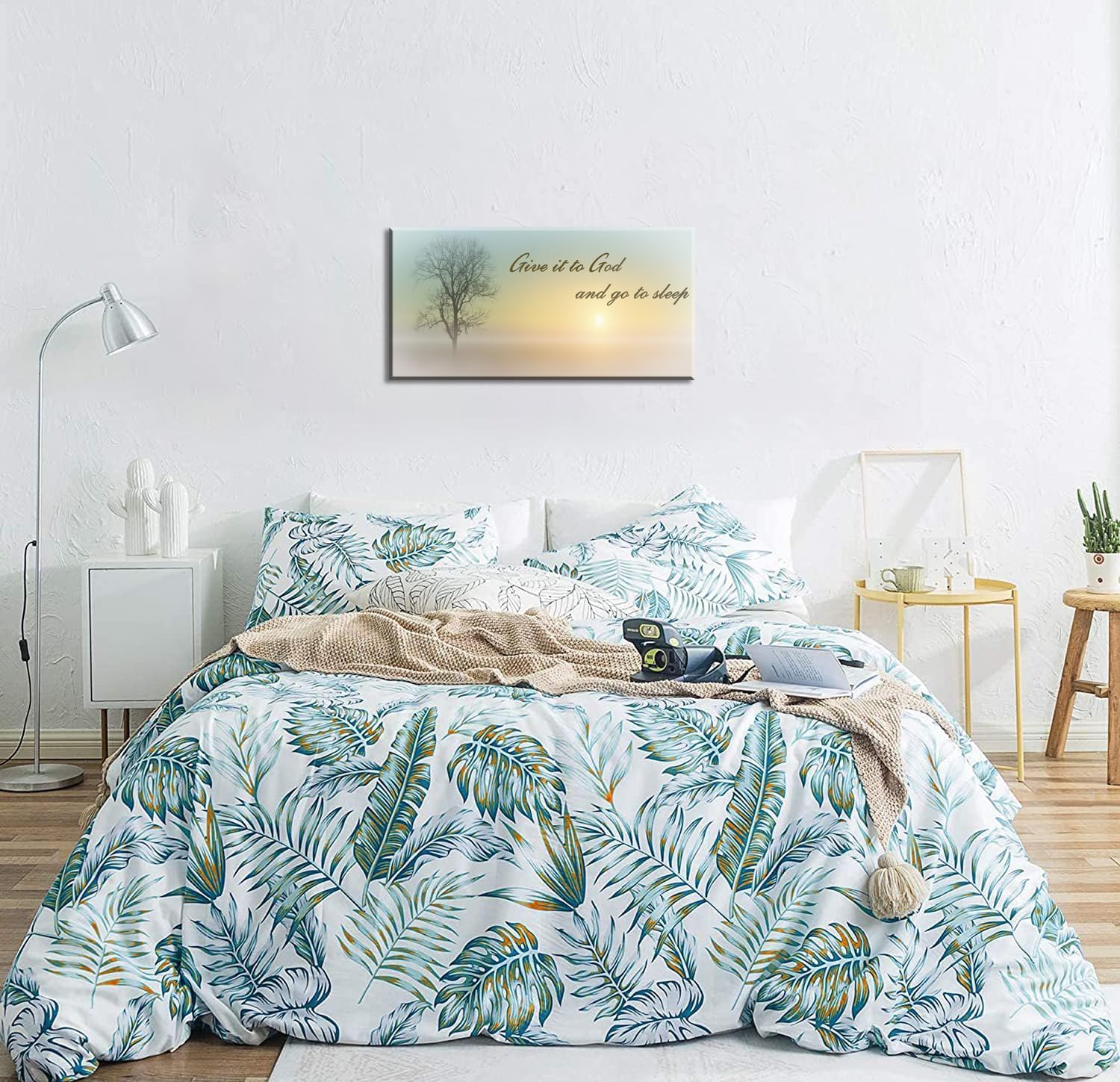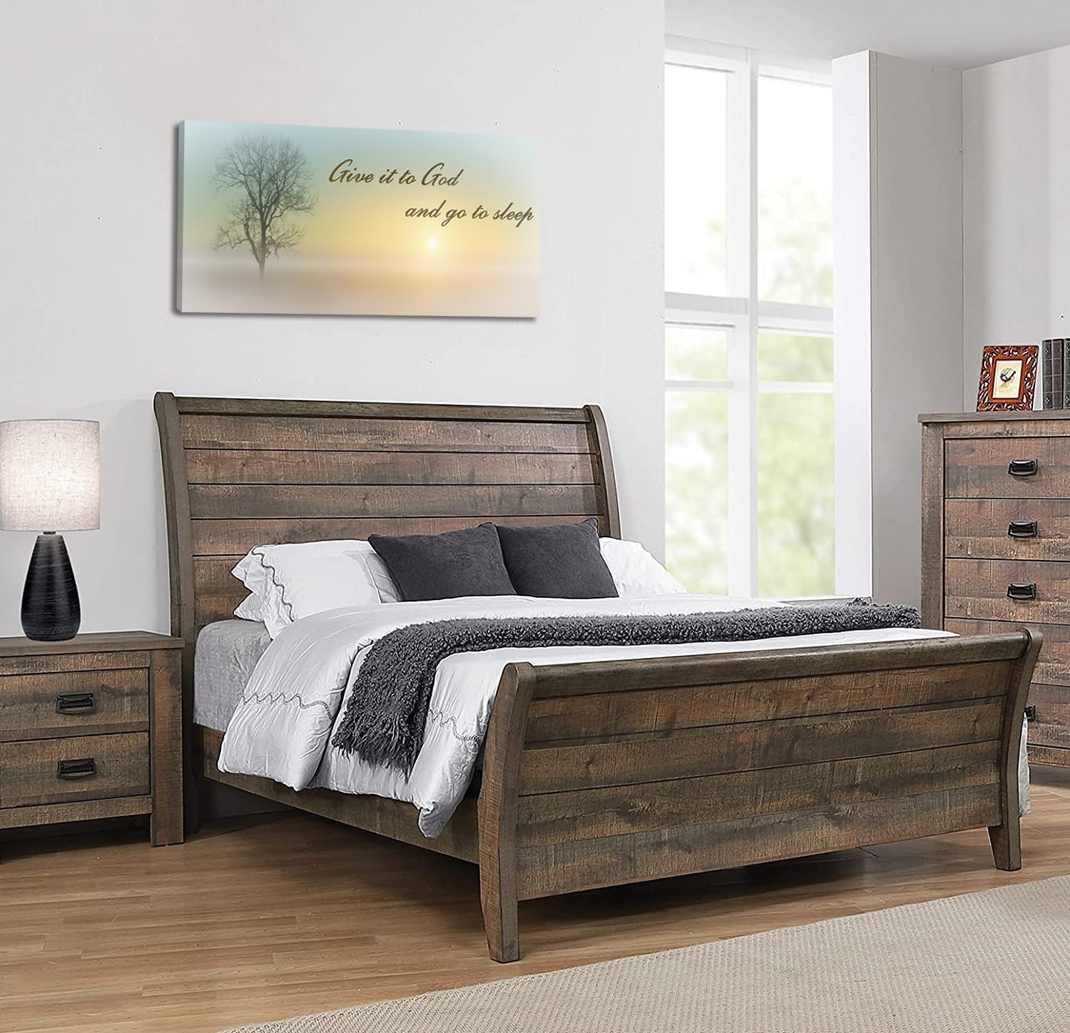 Lasdel Canvas Wall Art of Misty Sunset & Tree Plant Picture For Bedroom Home Above Bed, White Country Wood Sign For Bathroom, Give It To God & Go to Sleep Artwork Decor, Inner Frame 20x40 Inches