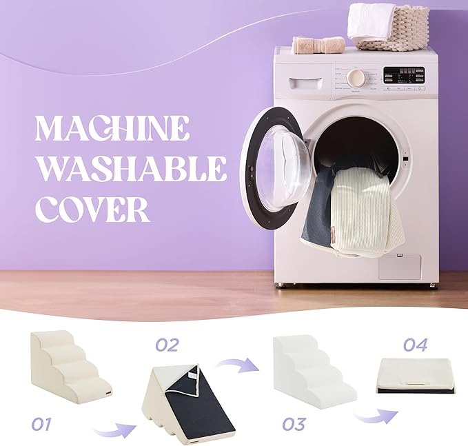 - Easy to Clean: Keeping these pet stairs for dogs fresh and tidy is a breeze. Simply remove the foam core and machine wash the outer cover separately in cold water on a delicate cycle. Please note, the foam core should not be machine washed or dried to ensure long-lasting use and comfort for your pets.
