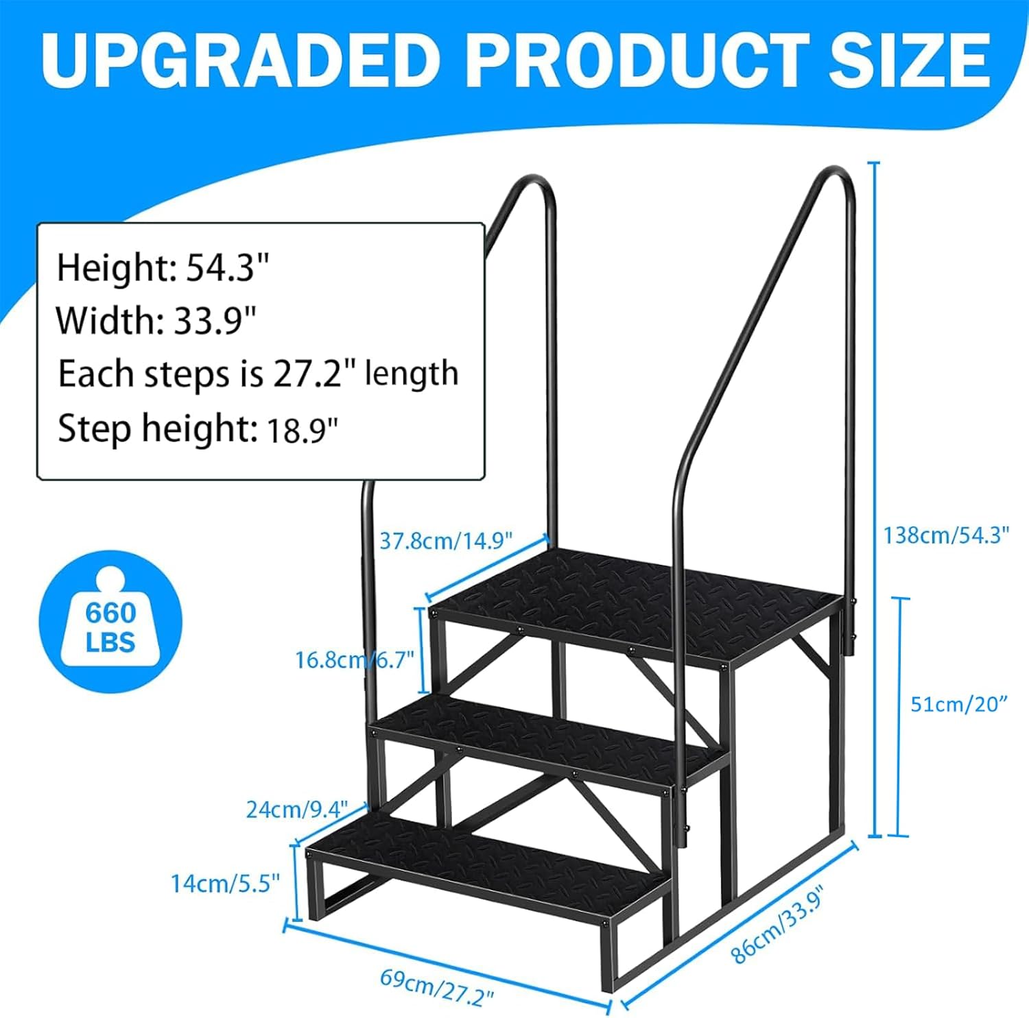 - 【Sturdy Steps】The weight capacity of our portable rv steps is 660 pounds, thus 5th-wheel RV stairs can withstand a lot of weight. Our step stool with handle is electrostatically sprayed to enhance corrosion resistance. The triangular bars of heavy-duty metal steps provide better stability and reduce the risk of swings and falls during use. The 3 step weight is 42.9lbs
