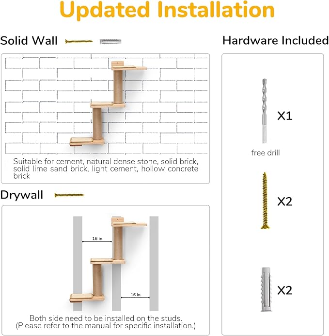 - STABLE AND SAFE - The cat wall perch is designed for 16 inch drywall, for stable support the both side need to be installed on the stud, you can mount it according to our instruction. Besides, The cat stair has wider surface, 7.6 inch x 12.9 inch, and the sisal mats are covered on every step, your cats will not slip-off when they use it, giving their more sense of security.
