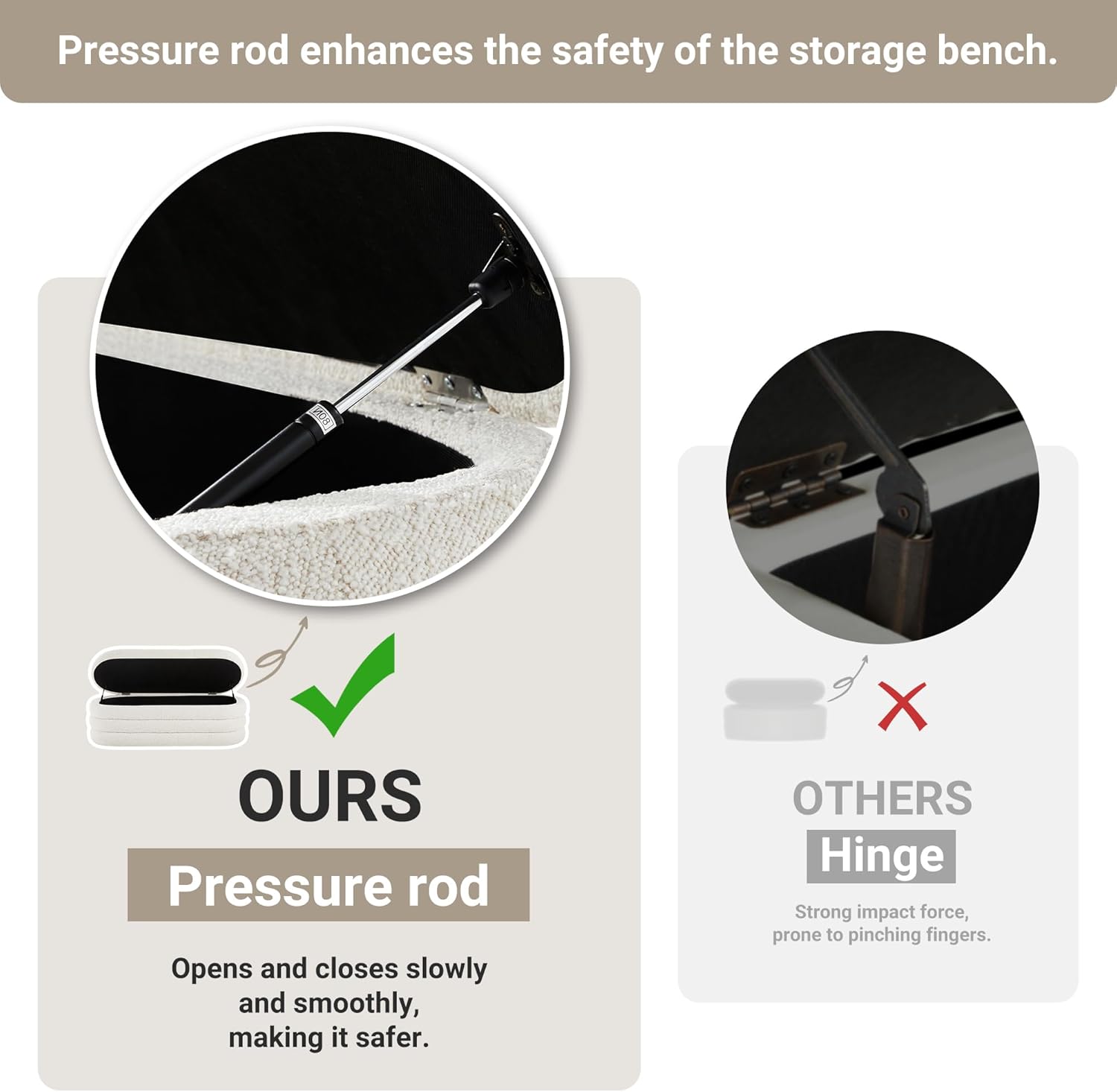 - SAFE PRESSURE BAR AND ROUNDED DESIGN: Ottoman bench features a pressure bar design that is safe and effortless to lift. The bench rounded appearance design helps to avoid children's injuries while playing, suitable for families with children.