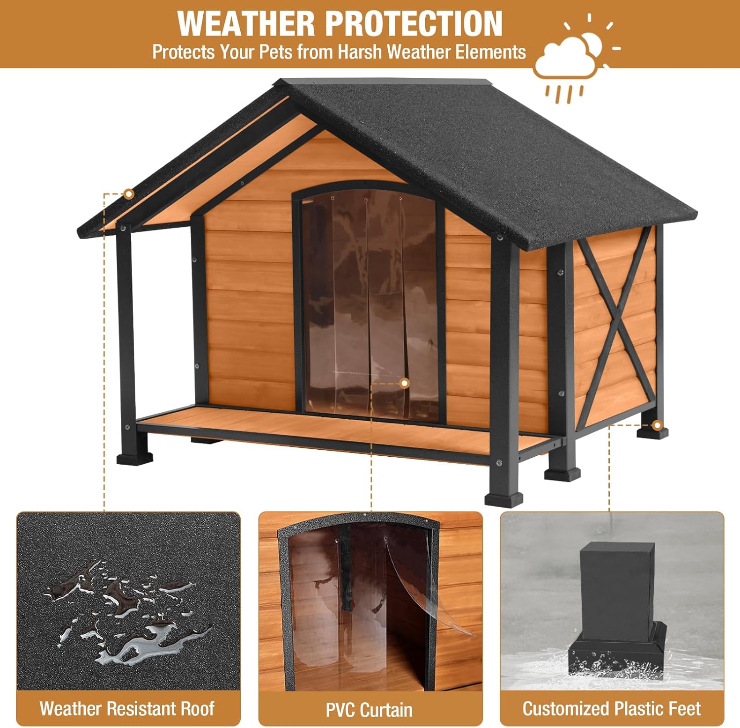 - 【Weather & Water Resistant】Cabin Dog house with security waterproof paint, raised floor with customized plastic waterproof feet pad & asphalt roof & high quality curtain provide protection from the elements and keep the cabin comfortable & dry.