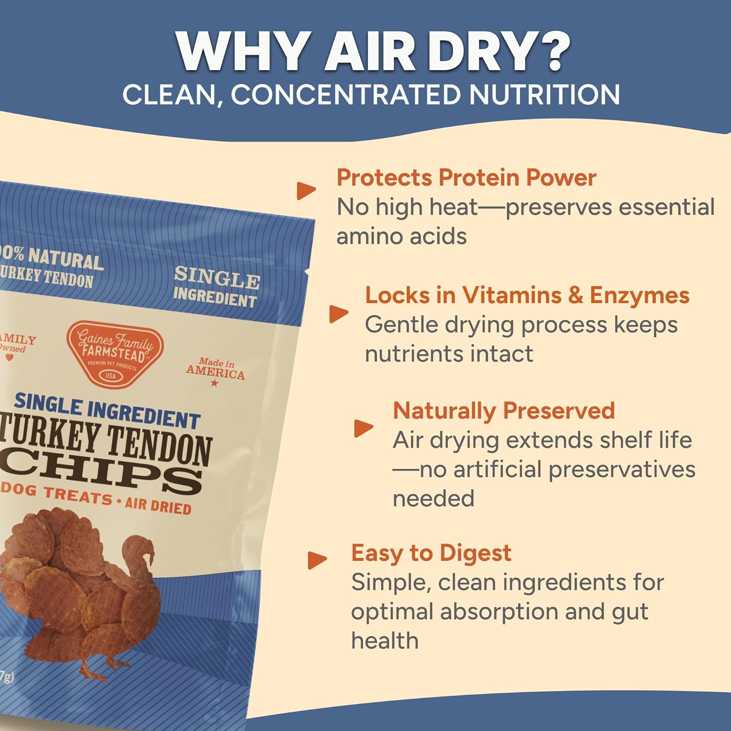 - AIR DRIED FOR NUTRIENT PRESERVATION: Our air-dried turkey tendon chips retain the natural proteins, vitamins, and enzymes of turkey tendons, ensuring that every bite delivers maximum nutritional value while maintaining ingredient quality. A healthy, natural chew for dogs of all sizes.