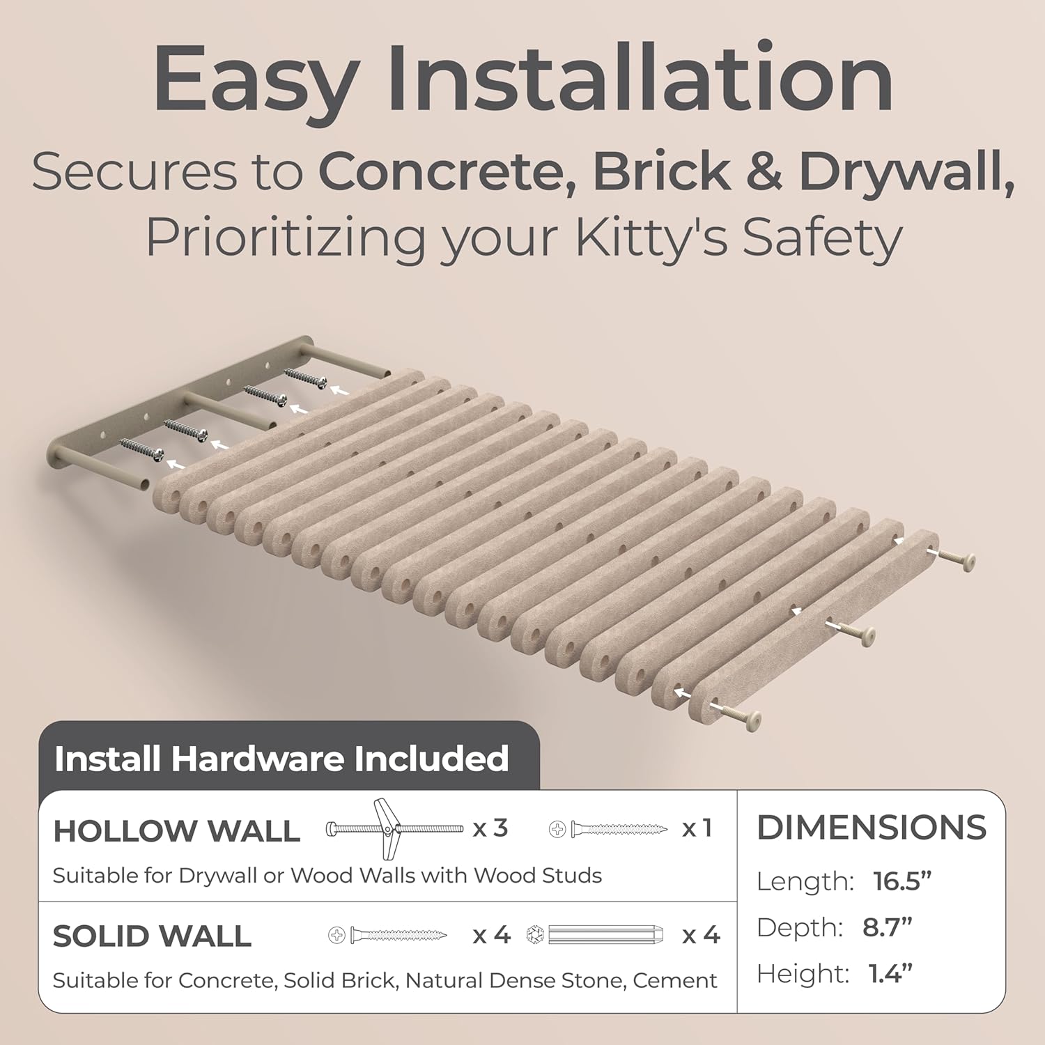 - Effortless Paradise: This cat wall bed includes all hardware, allowing your fur-baby to start exploring right away. Our cat climbing shelf securely attaches to concrete, cement, brick, dry wall and more ensuring your cat’s safety.