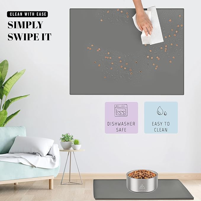 - Non-Slip Design: No more sliding bowls! AVERYDAY's heavy-duty pet mat stop bowls from sliding during meals. The dotted surface boosts slip resistance, ensuring your pets' food and water bowls stay securely in place