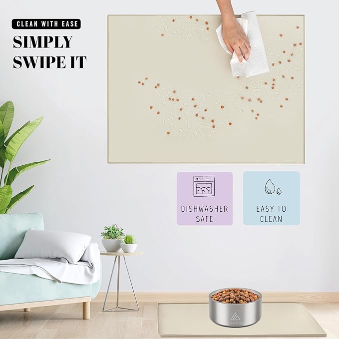 - Non-Slip Design: No more sliding bowls! AVERYDAY's heavy-duty pet mat stop bowls from sliding during meals. The dotted surface boosts slip resistance, ensuring your pets' food and water bowls stay securely in place