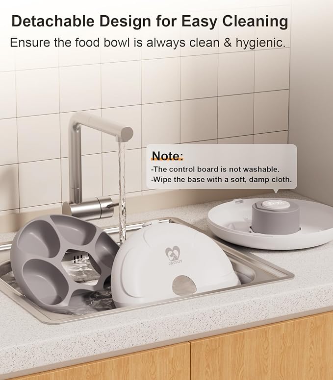 - 【Care for Your Pet's Safety & Health】These automatic cat feeders incorporate a paw-care design to prevent potential injuries. Crafted from food grade BPA-free ABS material, it prioritizes your pet's health. Both the top cover and food tray are easily removable for cleaning-simply rinse under running water. Note: Avoid getting the electronic components wet when cleaning.