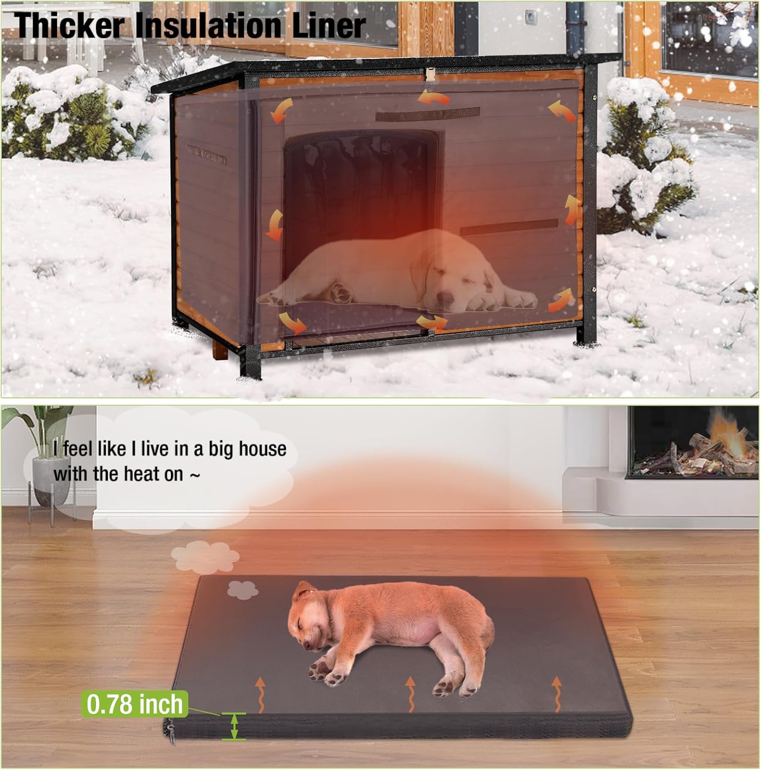 - Warm Insulation Liner: To enhance the coziness, our dog house with 0.78" thicker sponge insulated liner which will cut the outdoor cold temperature.It will effectively keep your pets warm in cold winter