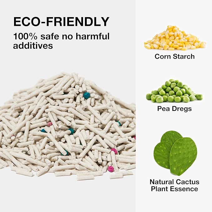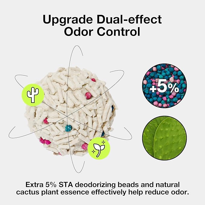 - 【Superior Odor Control】This tofu litter is infused with natural Cactus plant extract, which can help mask unpleasant odors. Plus, extra added 5% deodorizing beads that effectively control odors, ensuring a fresh and odor-free space